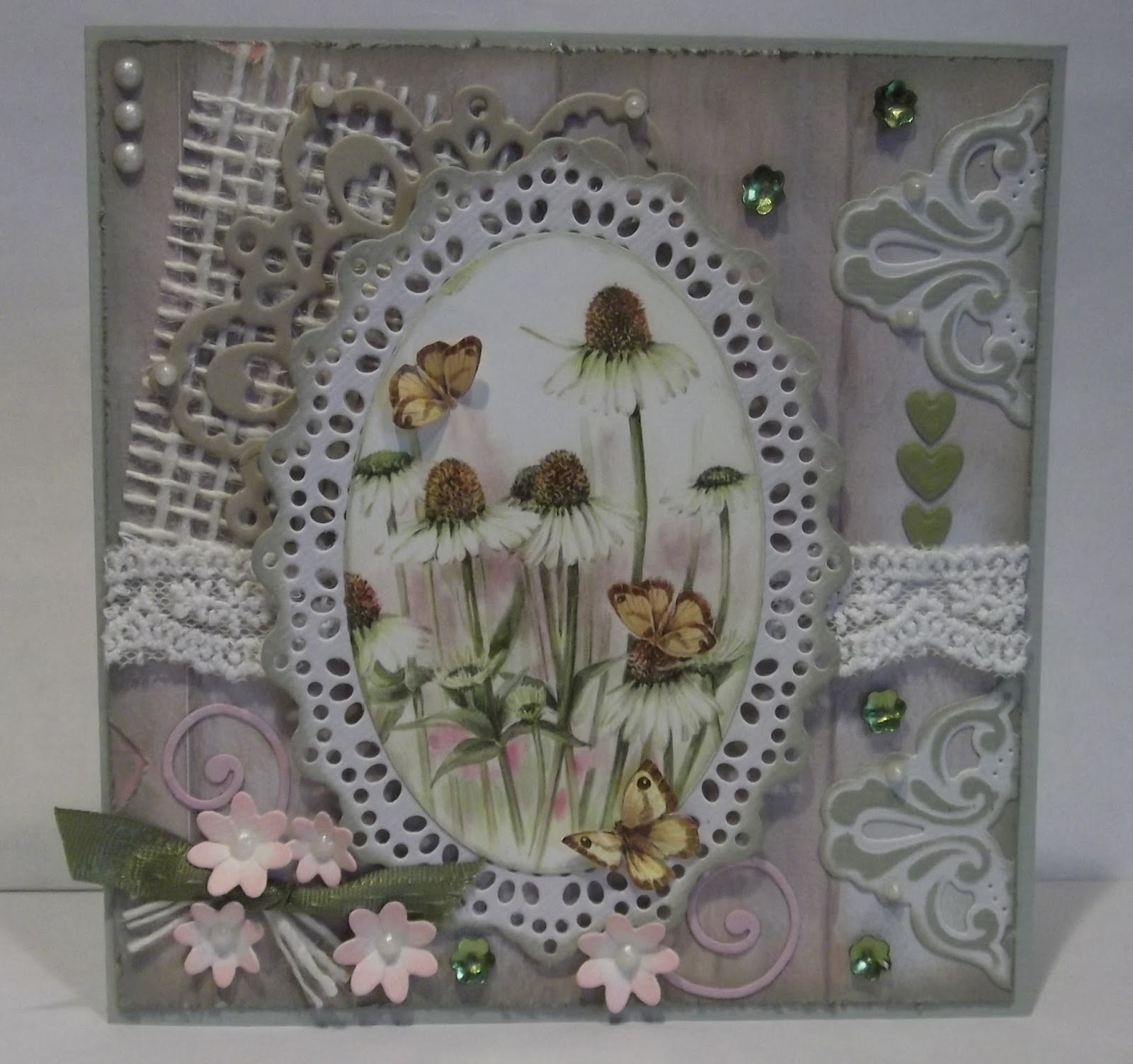 I just have the one picture for you today, the camera isn't playing ball on the close ups and this one is a bit off on the colours - ah well!  I've used another pretty picture from the Mattie's Flowers cutting sheet, the picture is actually a circle but I've cut it into an oval to fit the pretty Marianne Design lacy frame CR1204.  The background paper is a sheet that looks like floorboards from the Country Style paper pack, I've roughed up and inked the edges for a more rustic look as well as inking the edges of the picture and lace mat.  To embellish I raided the bit boxes and found the little green hearts, lavender swirls and flower sequins.  I've cut a fancy MD die cut in half to decorate the edge of the card, inking the embossed areas to tie things in.  And I found the snowflake circle die already cut out in my bit box ready to tuck in behind the picture on top of a piece of jute ribbon and length of lace.  I've die cut a few tiny flowers with the tiny flower strip die then finished off with scraps of ribbon, twine and liquid pearls.
