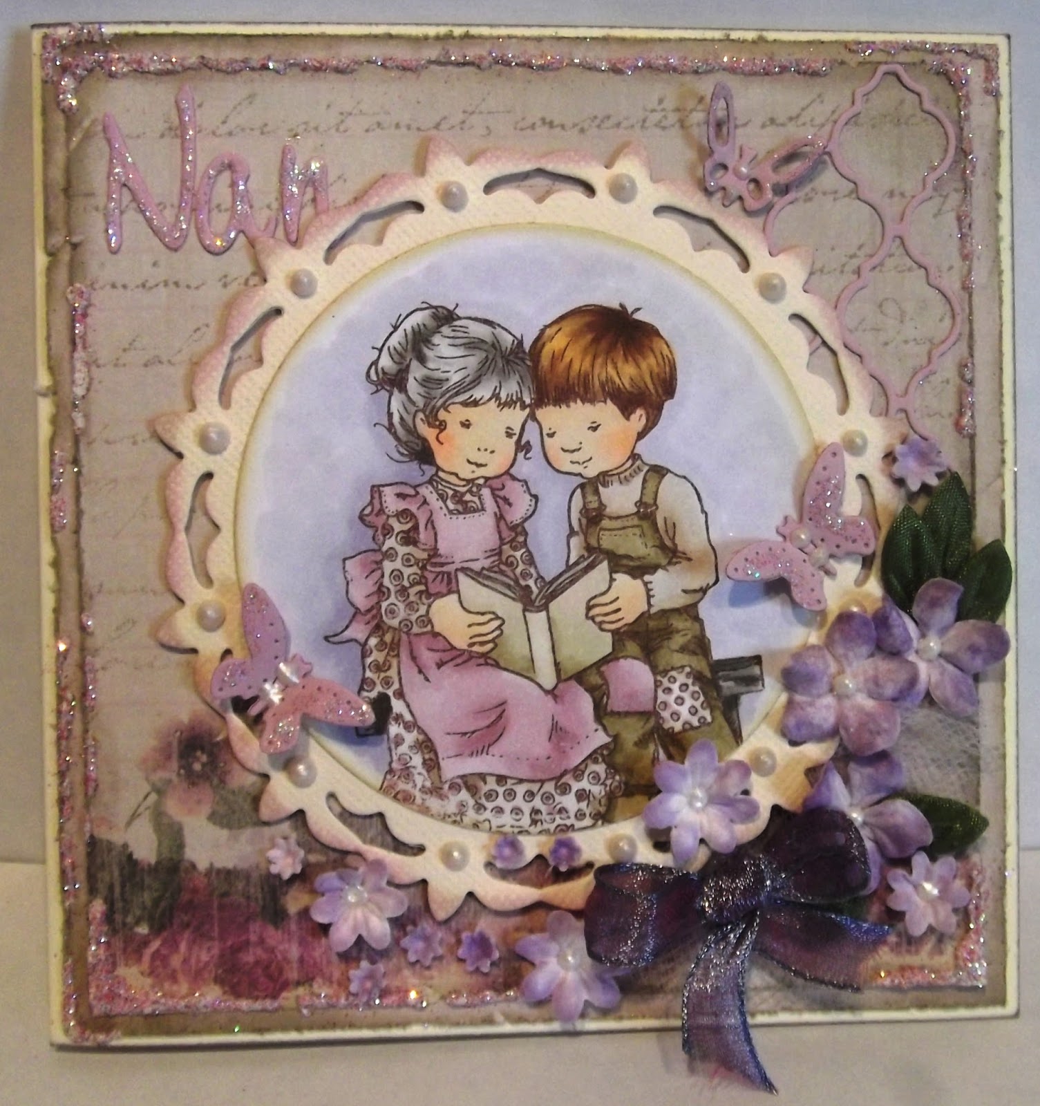 The papers are from the new Studio Light paper pad #31, very vintage and very pretty.  I've over stamped the top layer with the new Marianne Design Anja's script stamp and blinged up the edges with the 3d snow and loose glitter added on top.  Then I've decorated with liquid pearls, die cut blooms and butterflies and a tiny piece of wired organza ribbon.  Here's a close up of the corner: